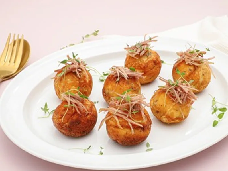 Traditional Danish æbleskiver batter enriched with pan-fried duck and caramelized onions, folded with whipped egg whites for pillowy texture. Served warm topped with shredded duck confit and fresh thyme. A savory take on the classic spherical pancake.