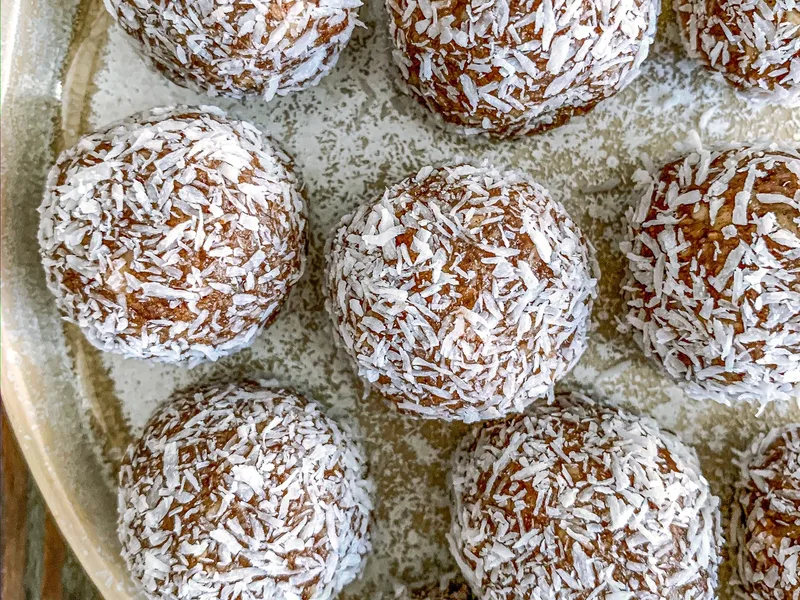 No-bake energy balls combining soaked dates and cashews with almond butter, shredded coconut, and warm spices. Optional collagen peptides add protein. Roll in coconut and chill until firm. Perfect for dessert, snacks, or gift-giving.