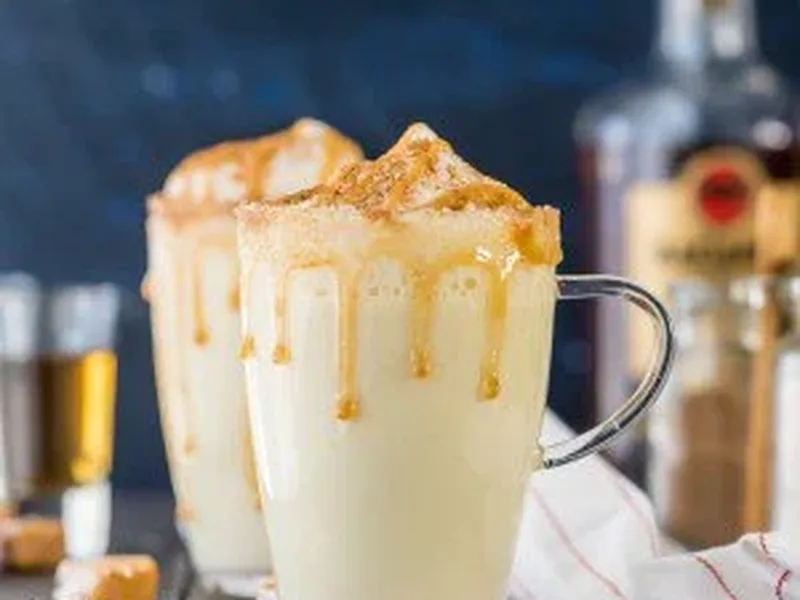 Rich, creamy eggnog infused with warm cinnamon and nutmeg, sweetened with salted caramel and spiked with dark rum. The dairy base is steeped with spices then tempered with beaten eggs and sugar, creating a luxurious holiday drink. Serve chilled with a fluffy egg white foam topper and caramel drizzle for an elegant twist on a classic. This version balances sweet caramel against bright sea salt for complexity beyond standard eggnog recipes.