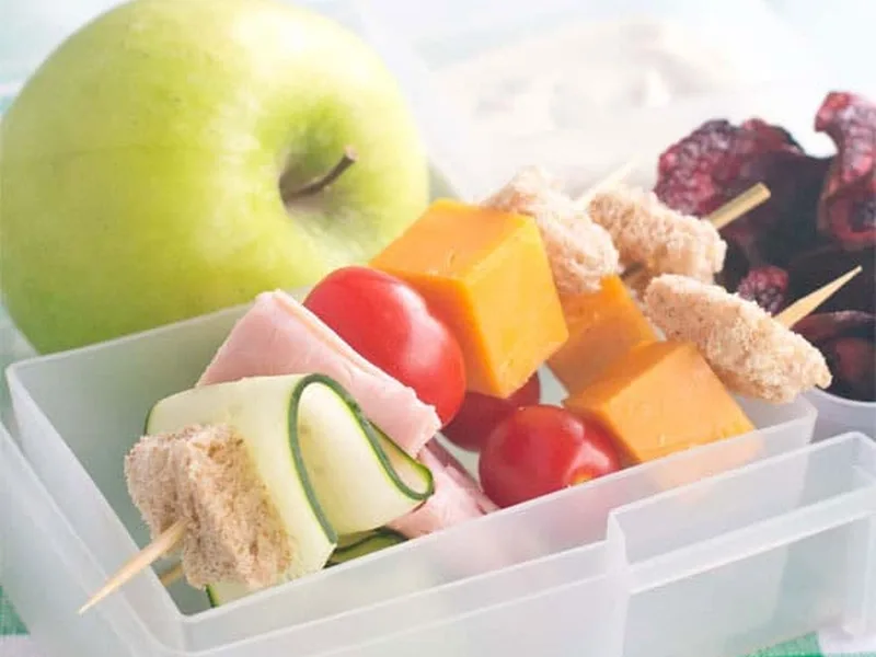 Portable lunch featuring skewered sandwich components—grape tomatoes, low-fat Cheddar, whole wheat bread, ham, and cucumber—paired with roasted beet slices and creamy Greek yogurt. Beets are brushed with olive oil and roasted at 375°F until edges brown, creating a sweet, earthy contrast to the savory kabobs. Perfect for meal prep and lunchboxes.