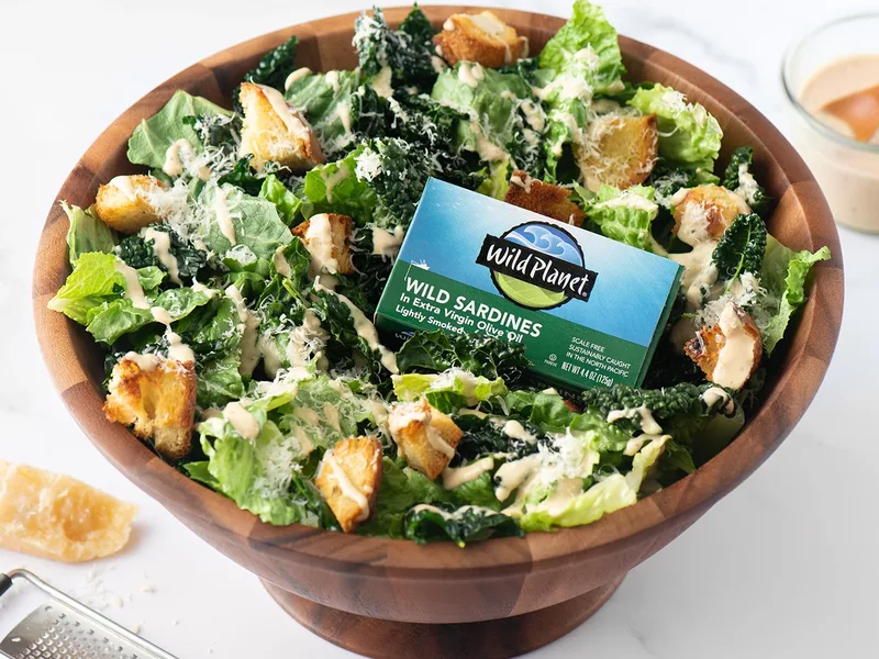 A nutrient-dense Caesar salad enhanced with wild sardines, delivering omega-3 fatty acids and protein in every bite. This version ditches canned anchovies for whole sardines, creating a cleaner, less funky flavor while maintaining the dressing's signature umami depth. Crispy homemade croutons provide textural contrast to tender massaged Dino kale and lettuce, while a creamy emulsified dressing made with mayo, Dijon mustard, and Worcestershire brings richness. Sardines offer a sustainable protein source with mild briny notes that complement rather than overpower the salad. Perfect for health-conscious diners, those seeking anti-inflammatory meals, or anyone wanting restaurant-quality salad at home. Serve as a satisfying lunch or light dinner. This interpretation replaces anchovy paste with whole sardines, making it more approachable for sardine skeptics while boosting nutritional value and offering superior texture.