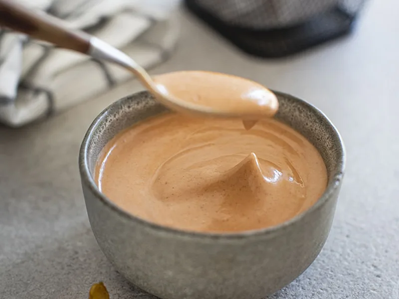 Quick vegan cocktail sauce combining vegan mayonnaise, ketchup, and whiskey with fresh lemon juice, cayenne pepper, vegan Worcestershire sauce, and Tabasco. Mix and season to taste with salt. Ready in minutes for appetizers, seafood alternatives, or dipping.