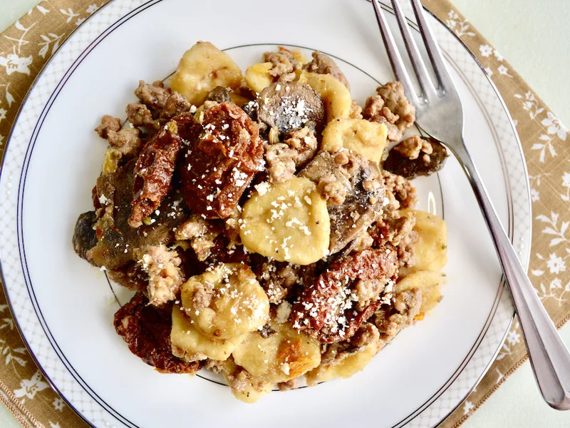 Brown crumbled Italian sausage with cremini mushrooms, garlic, and sun-dried tomatoes, then deglaze with red wine. Toss with orecchiette pasta and reserved cooking water to create a silky Parmesan sauce. Ready in about 30 minutes.