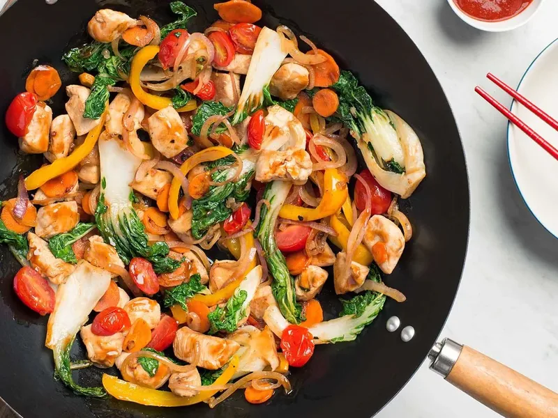 Do not overcrowd the wok or skillet to ensure vegetables cook evenly and chicken browns properly.