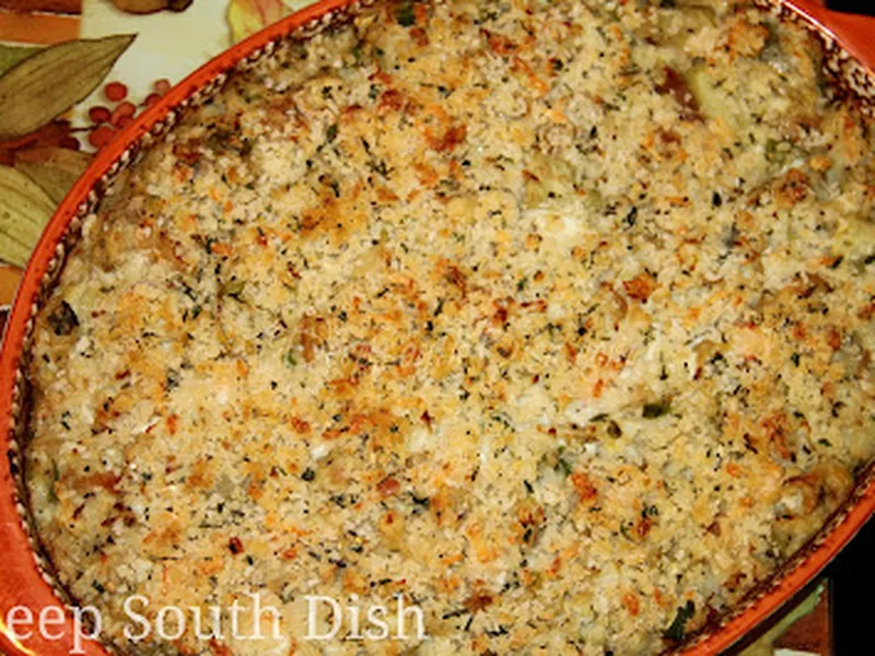A savory Southern casserole combining tender eggplant with Gulf shrimp and crabmeat, bound with bread and herbaceous seasonings. This dish bridges vegetable-forward cooking with briny seafood, creating complexity through layered flavors of basil, sage, rosemary, and optional Cajun heat. The panko topping provides textural contrast to the soft, custardy interior. Best suited for home cooks comfortable with multi-step preparation and seafood handling. Serve as a composed main course at casual gatherings, holiday tables, or when you want an impressive but not overly formal dinner. This version distinguishes itself by treating eggplant as the structural foundation rather than a supporting player, building the entire casserole around its subtle sweetness, while the dual shellfish approach adds restaurant-quality depth absent from simpler vegetable dressings.