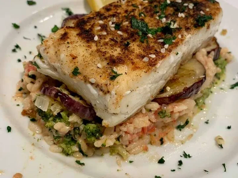 Pan-seared Chilean sea bass with crispy flour crust paired with creamy arborio risotto studded with roasted shallots, fresh tomatoes, and blanched broccoli. The fish develops golden edges from high-heat searing, then finishes gently in the oven to stay tender and flaky. Serve this elegant plated dish for special dinners or when impressing guests with restaurant-quality technique at home. The contrast between the silky risotto and delicate fish showcases why this combination remains a classic fine-dining pairing.