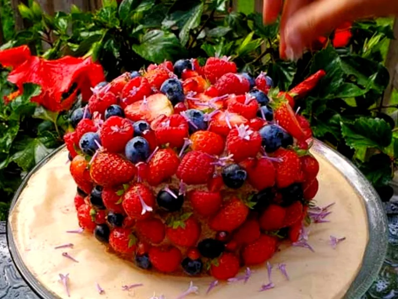 Decorate with fresh strawberries, raspberries, and blueberries. Add flower petals as desired.
