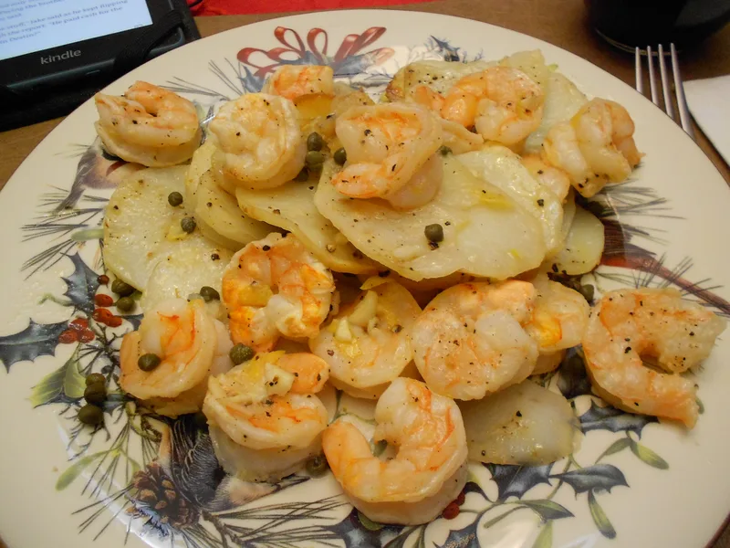 A bright, elegant one-pan dinner featuring jumbo shrimp and golden-roasted potato slices tossed with garlic, fresh lemon, and briny capers. The shrimp marinates briefly in olive oil and lemon before joining pre-roasted potatoes for a quick final bake. Tangy and aromatic with crispy potato edges, this comes together in under 35 minutes. Perfect for weeknight entertaining or an easy date night at home. The lemon-caper sauce clings to everything, making this feel restaurant-quality without the fuss.