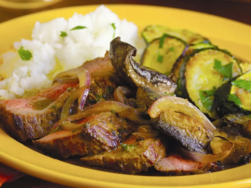 Trim steak and prepare mushrooms and onion up to 4 hours ahead. Store separately. Sear steak just before serving.