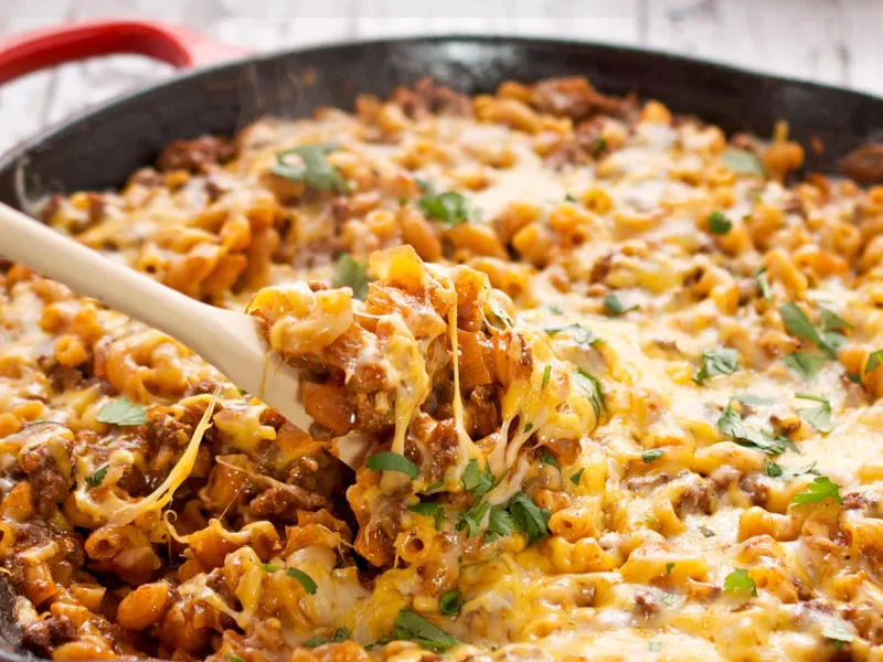 One-pan chili mac combines seasoned ground beef, elbow pasta, and melted Mexican cheese blend for a comforting weeknight dinner. Warm spices (chili powder, cumin, red pepper flakes) layer into tomato sauce while pasta cooks directly in the skillet, absorbing all the flavors. The cheese topping melts into creamy richness. Serve hot to families or casual gatherings looking for simple, satisfying comfort food. This version cooks everything together in one skillet, eliminating pasta-cooking cleanup.