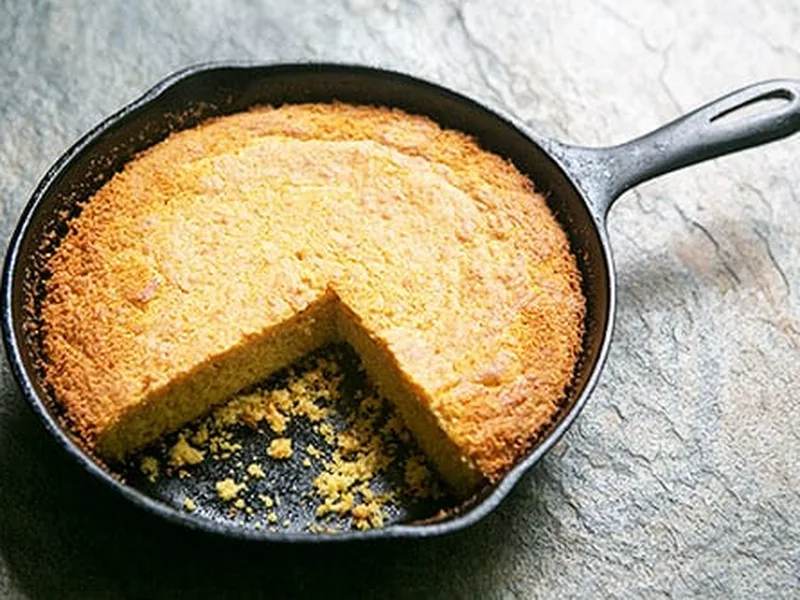 A crispy-edged Southern classic made in cast iron, this cornbread gets its savory depth from bacon grease heated to smoking in the skillet before the batter hits the pan. Stone-ground cornmeal and buttermilk create tender crumb with subtle tang, while the combination of baking powder and soda ensures a tender, cake-like interior beneath a golden-brown crust. Serve hot with butter as a side to barbecue, chili, or soul food dinners, or enjoy as breakfast bread with honey and jam.