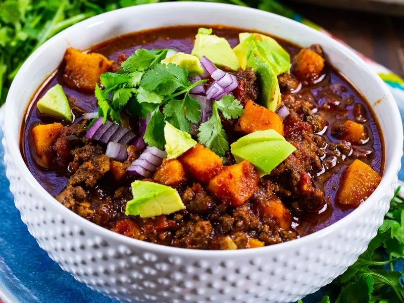 A hearty, warming chili that combines lean ground beef with tender sweet potatoes, fire-roasted tomatoes, and warm spices like cumin and oregano. The slow cooking method allows flavors to meld and deepen, creating a rich, complex base. Perfect for weeknight dinners, meal prep, or casual gatherings where you want something satisfying and easy. This version stands out by incorporating sweet potatoes instead of beans, adding natural sweetness and substance while keeping preparation minimal.