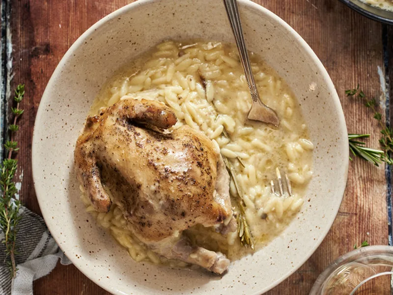 Serve each diner one whole hen nestled in orzo. Drizzle with pan juices. Pair with crusty bread to soak up sauce and a crisp white wine matching the cooking wine.