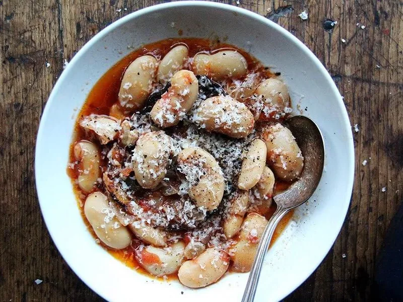 Creamy white beans braised low and slow with pancetta, San Marzano tomatoes, garlic, onion, and thyme. The beans absorb rich pork fat and tomato essence over hours, yielding tender legumes in a savory broth. Finish with crusty bread, aged Parmigiano-Reggiano, and olive oil for a rustic, warming bowl.