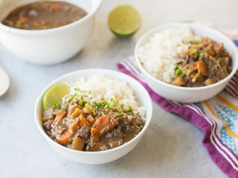 A comforting Japanese-style beef curry that combines tender chunks of beef with carrots, turnips, and potatoes in a mildly spiced, slightly sweet sauce. The slow-cooker method makes this perfect for busy weeknights or meal prep. Unlike traditional Indian curries, this version features a milder spice profile with hints of sweetness from brown sugar and ketchup, creating a family-friendly dish that's popular in Japanese home cooking. The curry develops rich flavors during the long, gentle cooking process while requiring minimal hands-on time.