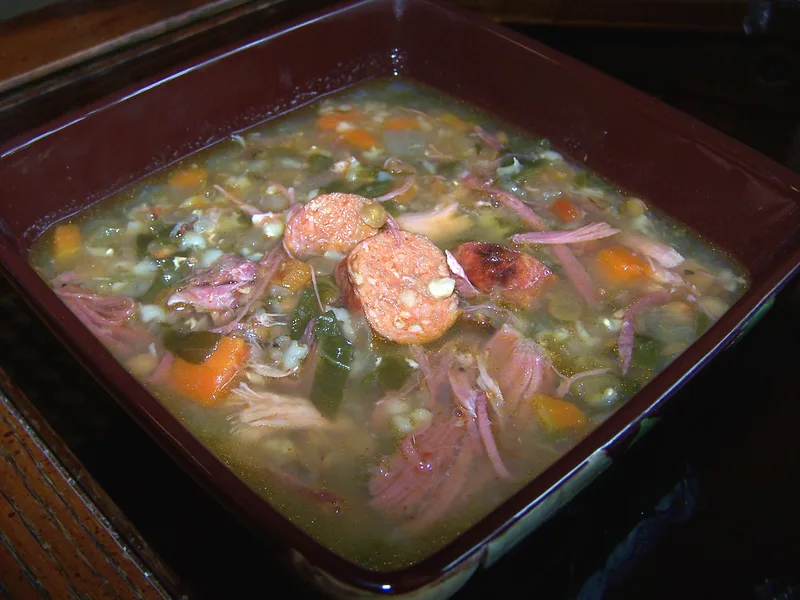 Use smoked turkey leg, bacon ends, or skip entirely and add 2 tablespoons soy sauce plus 1 tablespoon miso paste to 10 cups chicken or vegetable broth for umami and depth without pork.
