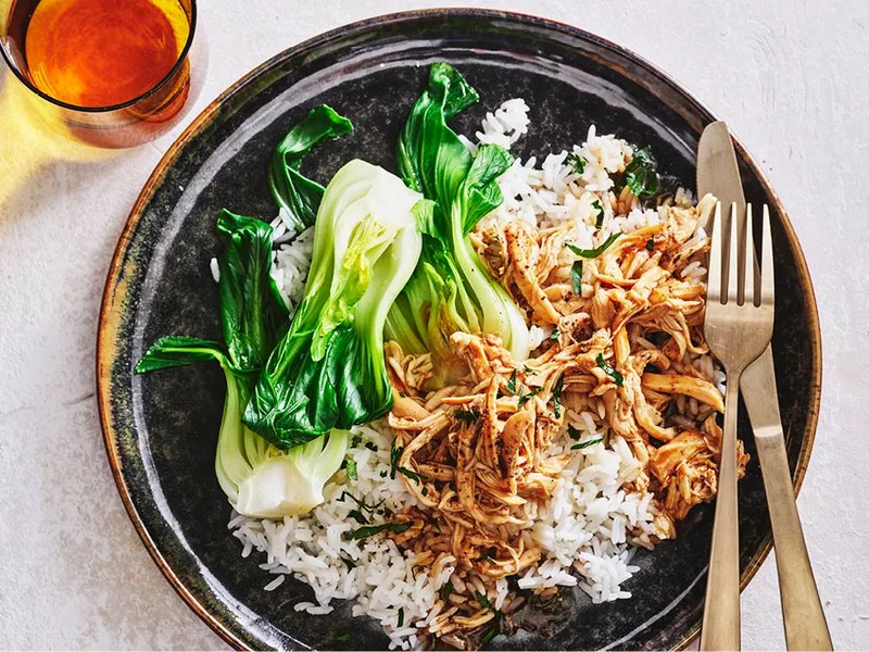 Boneless chicken breasts braised in reduced-sodium teriyaki sauce in a slow cooker, then shredded and served over jasmine rice with microwaved baby bok choy. Fresh cilantro garnish adds brightness to this hands-off weeknight dinner requiring minimal prep.