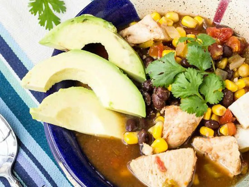 A hearty, warming soup that combines tender chicken with black beans, corn, and bold Tex-Mex spices in your slow cooker. The cumin and chili powder create an authentic southwestern flavor, while the vegetable juice cocktail adds depth and richness to the broth. Perfect for busy weeknights or meal prep, this satisfying soup feeds a crowd and gets better with time. Serve with crispy tortilla strips, melted cheddar cheese, and a dollop of sour cream for a complete comfort meal that brings restaurant-quality flavors to your kitchen.