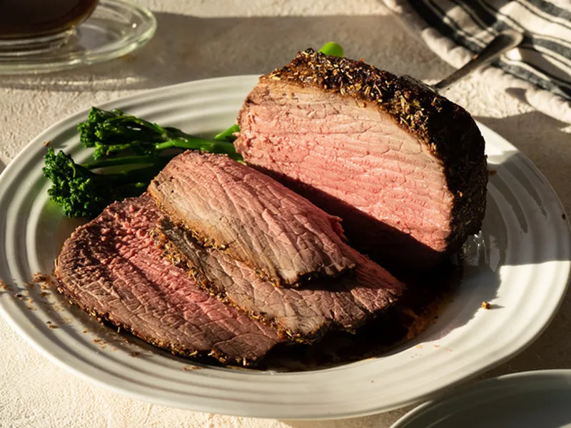 A lean beef roast transformed through slow-roasting, this method sears the exterior at high heat then gently cooks the meat at low temperature to preserve tenderness and develop a golden crust. Eye of round is an economical cut that benefits from this technique, emerging juicy and fork-tender. Ideal for Sunday dinner, weeknight special occasions, or meal prep. The garlic and rosemary coating adds classic savory depth without overwhelming the beef's natural flavor.