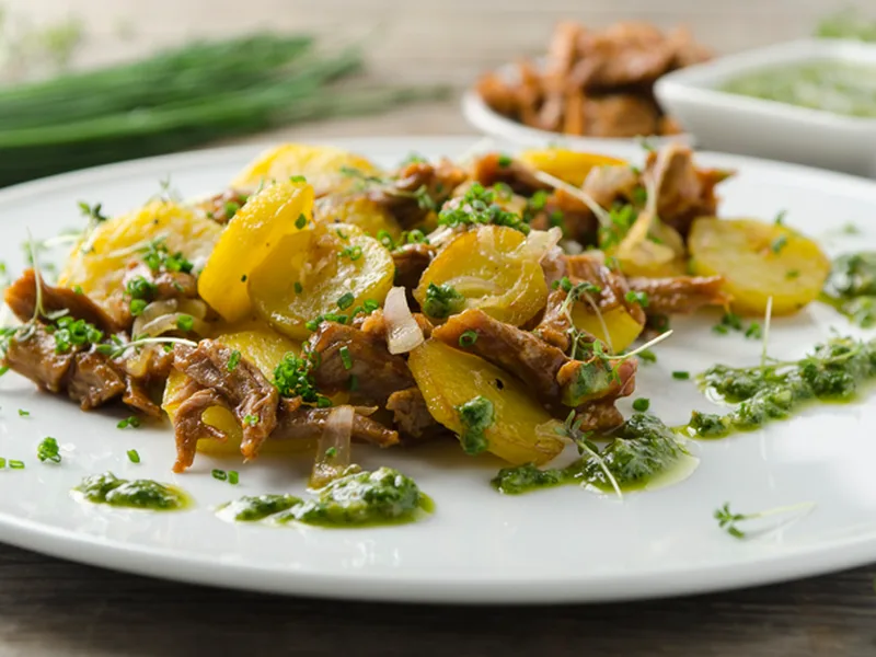 Strohschwein pulled pork is a German-Austrian specialty using heritage pork slow-roasted at low temperature until fall-apart tender, then shredded and glazed with a smoky-sweet barbecue sauce made from orange juice, apple cider, and maple syrup. The dish balances rich, savory meat with bright herbal salsa verde featuring parsley, basil, mint, capers, and anchovies, served over golden-fried waxy potatoes and shallots in a traditional grostl preparation. The smoking paprika, cumin, and dried garlic rub builds deep flavor during a 24-hour marinade. This restaurant-quality dish suits entertaining or special dinners, showcasing how low-and-slow cooking transforms humble pork shoulder into luxurious, tender strands. The Austrian grostl adds comfort while fresh salsa cuts richness. Perfect for feeding a crowd with minimal active time during the long braise.