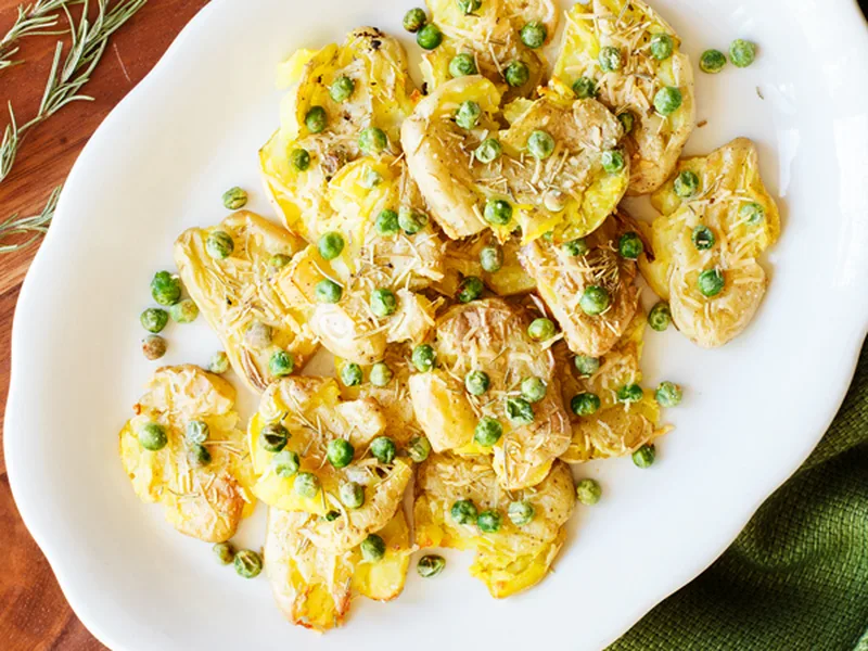 Fingerling potatoes are microwaved until tender, then smashed and arranged on a baking sheet with frozen peas, olive oil, rosemary, and Parmesan. Roasted until the edges crisp and turn golden brown. A simple, herbaceous side dish ready in under 30 minutes.