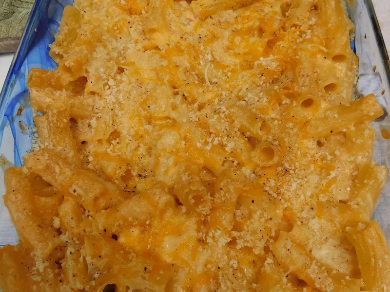Creamy five-cheese pasta baked in a smoker at 300 degrees for one hour. Cream cheese, mozzarella, cheddar-jack blend, and parmesan melt into a rich sauce coating short pasta, topped with a cheddar-jack and panko crust that browns lightly during smoking.