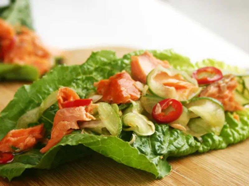 Fresh, no-cook lettuce wraps filled with smoked salmon, crisp cucumber ribbons, and bright herbs make an elegant appetizer or light lunch. The dish combines the richness of smoked salmon with the crunch of vegetables and cooling mint and basil for a balanced, refreshing bite. Tamari and lime juice create a savory-citrus dressing that tenderizes the cucumber through marinating. This version highlights quality ingredients with minimal preparation, perfect for anyone seeking a quick, protein-rich meal without cooking. Serve these at summer gatherings, weekday lunches, or as part of a seafood spread. The no-cook method and assembly-style preparation set this apart from heavier salmon dishes, making it ideal for warm weather entertaining or meal prep.