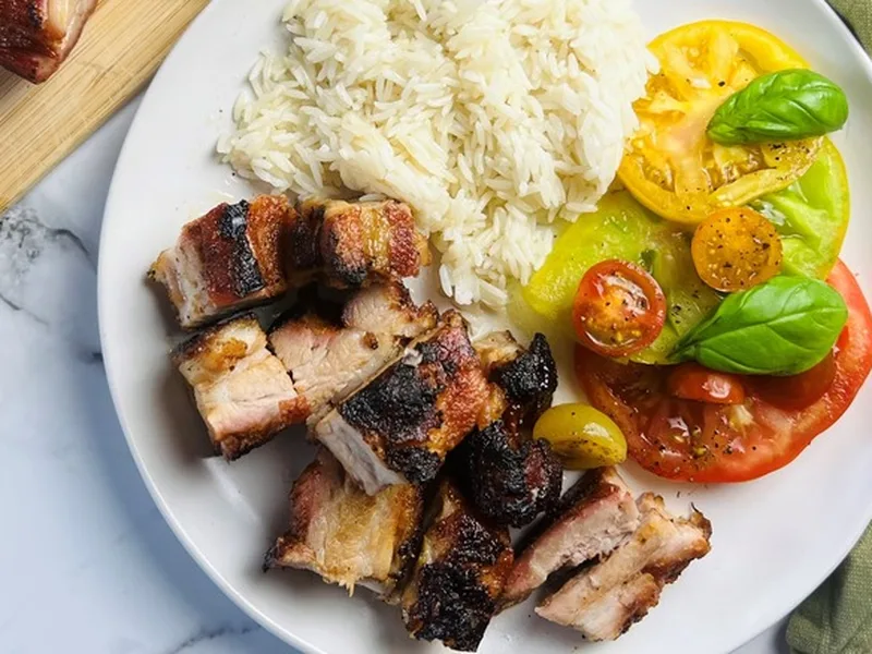 Slow-smoked pork belly with a fragrant dry rub of brown sugar, smoked paprika, and garlic, finished over direct heat for a caramelized crust. The extended refrigeration allows flavors to penetrate the scored fat while low-and-slow smoking renders it tender. This version uses apple or cherry wood and a two-stage cooking method—indirect smoking followed by high-heat searing—to achieve both deep smoke flavor and textured edges. Ideal for summer entertaining, casual outdoor feasts, or as a showstopping protein for pulled pork sandwiches or grain bowls.