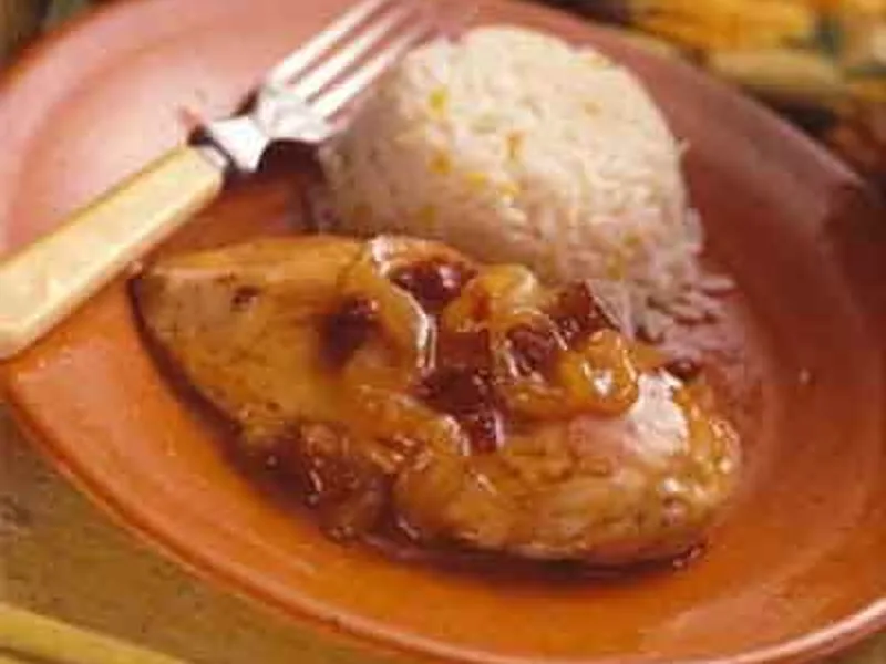 Serve sauce over chicken and hot cooked rice.