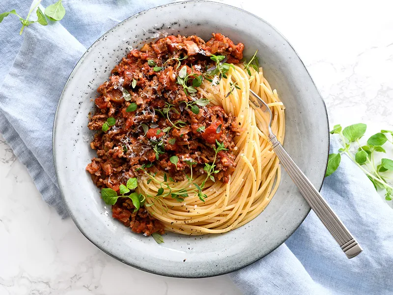 Spaghetti Bolognese with Bacon and Fresh Herbs
