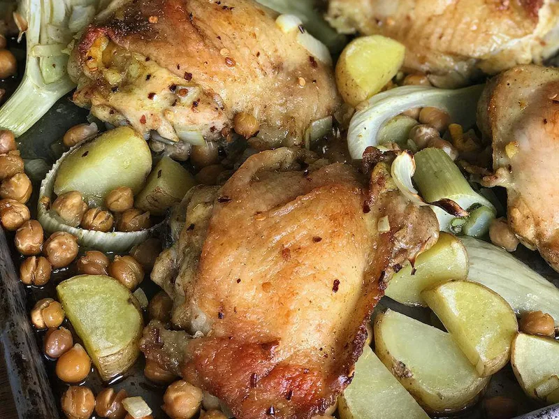 A warm, aromatic one-pan dinner built on bone-in chicken thighs marinated overnight in cumin, coriander, and turmeric, then roasted with potatoes, fennel bulbs, and chickpeas. The spice blend delivers gentle heat and earthy depth, while the sheet-pan method keeps everything moist and caramelized. Serve for weeknight family dinners or casual entertaining. This version's overnight marinade and layered vegetable approach ensures tender, deeply flavored chicken with crispy-edged vegetables.