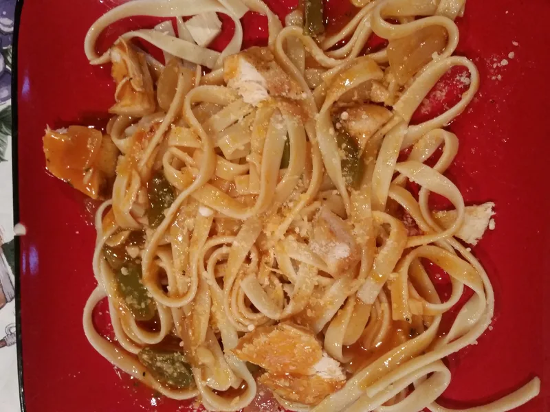 Restaurant-style fettuccine coated in a vibrant Cajun sauce made with V-8 vegetable juice, sauteed peppers, onions, and garlic, finished with sliced chicken breast and Parmesan. The sauce balances vegetable sweetness with cayenne heat and umami depth. Ideal for weeknight dinners when you want bold flavors without fuss. This version uses accessible pantry ingredients and requires minimal technique, making it approachable for home cooks seeking restaurant-quality results.