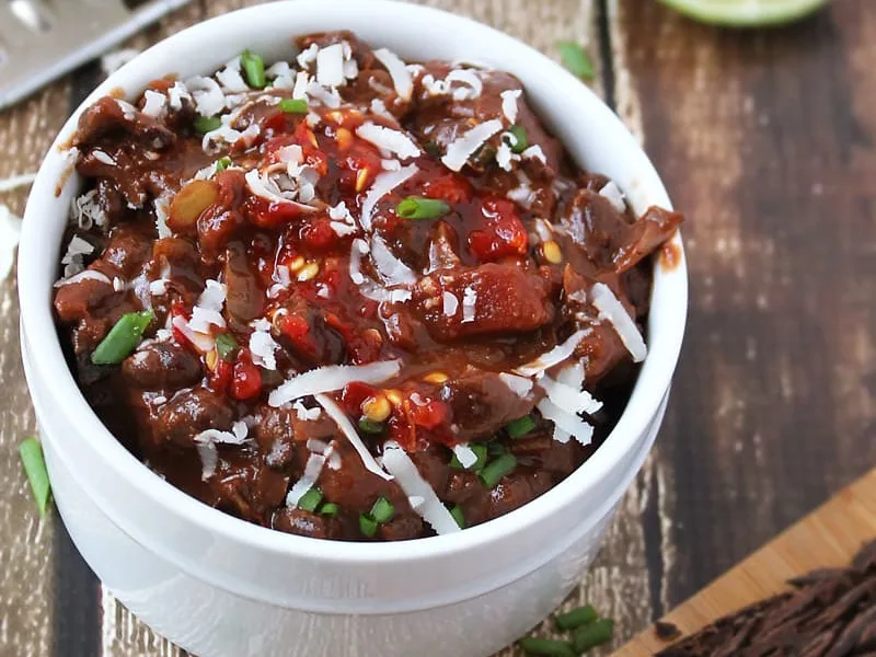 Aromatic dip combining black beans, dark chocolate, and warm spices like cumin, coriander, and chili powder. Onions soften in olive oil, then vegetable broth, tomato paste, and beans simmer until the chocolate melts into the mixture. Finished with fresh lime juice and diced tomatoes. Serve with sambol olek, cheese, and chives.