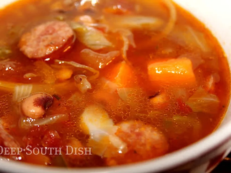 A hearty, one-pot Creole-inspired soup combining smoky andouille sausage with sweet potatoes, black-eyed peas, and tomatoes. The combination of roasted vegetables, spiced smoked meat, and legumes creates layers of savory warmth with subtle heat. This rustic, comforting bowl works well as a weeknight dinner or casual entertaining option, especially welcome in cooler months. The addition of V-8 juice and fresh cabbage distinguishes this from standard versions, adding brightness and textural contrast to the creamy sweet potatoes.