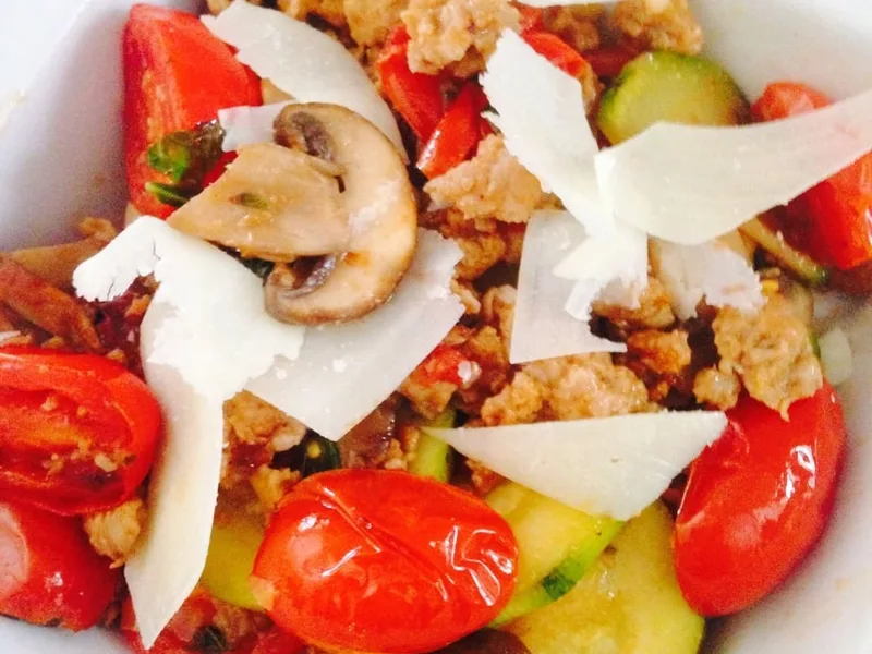 A quick, protein-packed skillet meal that combines lean spicy poultry sausage with fresh seasonal vegetables in a light, zesty preparation. The dish balances heat from the sausage with bright lemon juice and aromatic basil, creating a balanced one-pan dinner. Sauteed zucchini, mushrooms, and tomatoes retain a pleasant texture against the crumbled or sliced sausage, while Parmesan adds a savory finish. This weeknight-friendly recipe suits anyone seeking a low-fuss, high-flavor meal under 30 minutes. Serve as a standalone bowl or over grains. The version here emphasizes vegetable-forward cooking with minimal oil, making it accessible for those watching fat intake while maintaining robust spice and fresh herb aromatics.