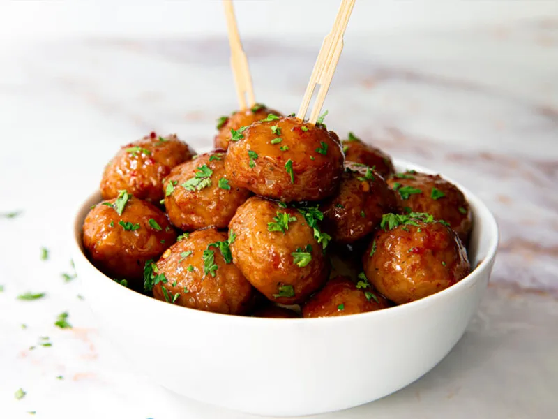 Quick weeknight chicken meatballs glazed in a tangy-sweet sauce of grape jelly and Thai chili sauce. Frozen meatballs simmer until cooked through, then the sauce reduces to a glossy glaze in minutes. Finished with fresh parsley.