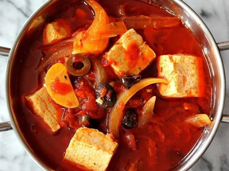 A vibrant Spanish-inspired braise of firm tofu in a smoky, heat-layered red pepper sauce built from fire-roasted peppers, sun-dried tomatoes, and jalapeños. Crushed red pepper flakes, smoked paprika, and cayenne create complex warmth balanced by briny kalamata olives. Serve hot as a vegetarian main course or alongside rice; the sauce clings to the tofu as it absorbs the spiced flavors during its simmer. This version emphasizes slow-cooked depth rather than raw peppers, letting the aromatics meld into a cohesive, peppery stew.
