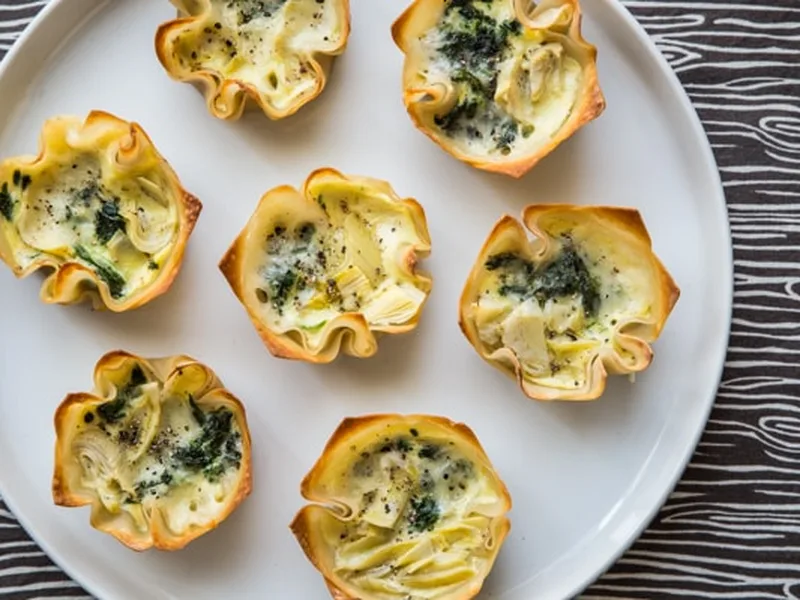 Bite-sized quiches featuring creamy spinach and artichoke filling nestled in golden, crispy wonton wrapper crusts. The tangy artichoke hearts and earthy spinach pair beautifully with rich Fontina cheese, while the wonton wrappers create an unexpectedly delightful crust that's lighter than traditional pastry. Perfect for brunch gatherings, holiday appetizers, or meal prep breakfast options that can be made ahead and reheated throughout the week.