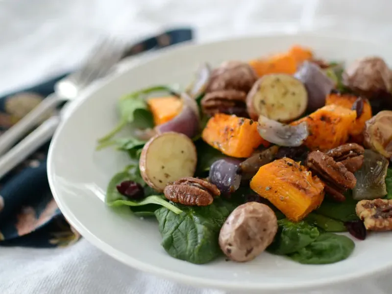 Warm salad combining tender roasted butternut squash, potatoes, and red onion over fresh spinach, topped with cayenne-spiced pecans and tart crasins. A sheet-pan meal with herbes de Provence seasoning and bright lemon vinaigrette.