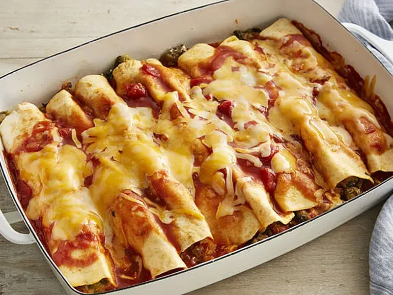 These spinach and turkey enchiladas deliver a lighter take on a Mexican-American classic, combining lean ground turkey with nutrient-rich frozen spinach for a protein-packed filling. Roasted green chilies provide authentic smokiness and subtle heat, while a blend of cumin and garlic powder builds savory depth. The filling stays moist thanks to fat-free sour cream, and a two-sauce topping—taco sauce mixed with chunky salsa—creates layers of flavor without excess fat. Whole grain tortillas add fiber and nutrition. This is ideal for weeknight dinners, meal prep, or feeding a family without sacrificing flavor. The dish suits anyone seeking lighter comfort food or looking to sneak vegetables into a crowd-pleasing casserole. Serve with lime wedges, cilantro, or a simple green salad. What sets this version apart is the focus on whole grains and reduced-fat dairy while maintaining the warming, cheesy casserole appeal of traditional enchiladas.