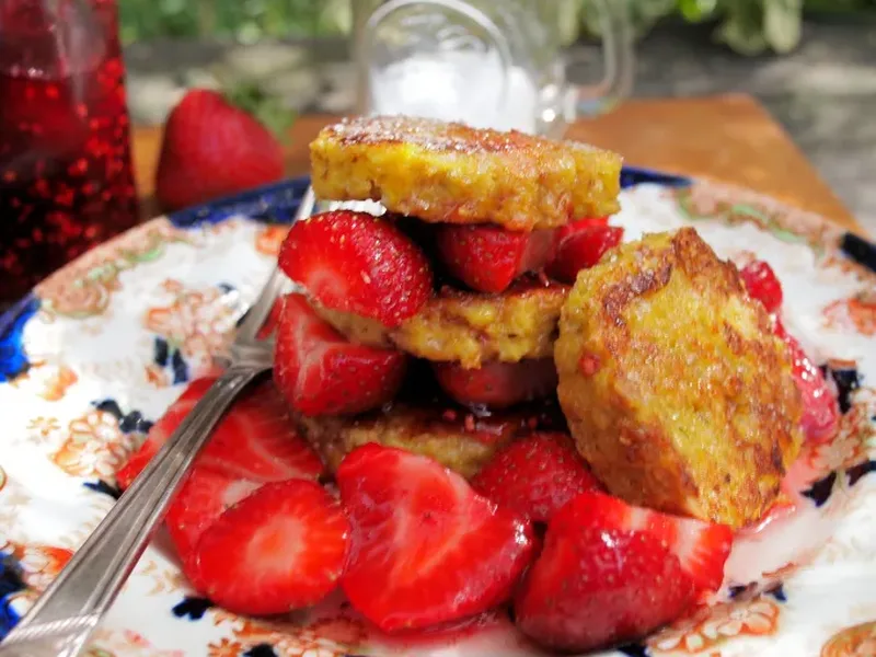 French toast enhanced into elegant stacks with homemade strawberry compote. Thick-cut wholemeal bread soaked in beaten egg and milk, then pan-fried until golden and crisp on the outside while remaining custardy within. The strawberry compote balances richness with bright fruit acidity, combining jam with fresh hulled strawberries and a touch of sugar. This version uses wholemeal multiseeded bread for nutty depth and texture contrast against the soft interior. Perfect for weekend breakfast or brunch when you have stale bread on hand. Assemble as individual stacks for restaurant-style plating. The key is soaking bread just enough to absorb egg without becoming soggy, and frying at medium heat for even browning. Best served immediately while bread is still warm and compote is runny.