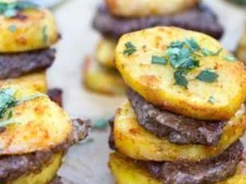 Elegant stacked presentation of roasted spiced potato slices layered with pan-seared beef tenderloin slices. Golden potatoes are seasoned with garlic, onion, and paprika, then baked until tender. Thin-cut tenderloin is quickly seared and stacked in descending size order, finished with fresh tarragon and truffle oil for a sophisticated dinner centerpiece.