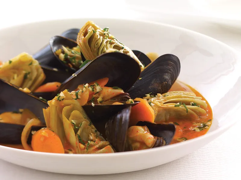 30-Minute Steamed Mussels and Artichokes