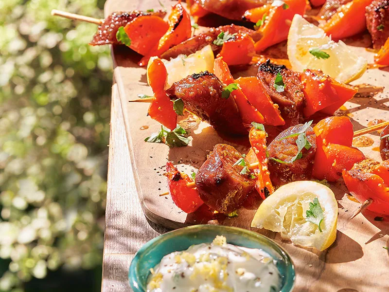 Sticky Chorizo Mini Skewers with Yogurt Dip