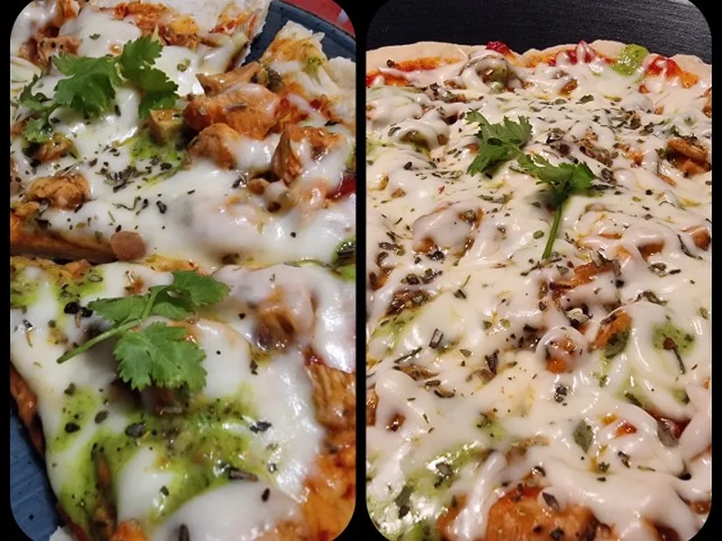 A no-oven chicken pizza made entirely on the stovetop, combining Indian spice blends with a soft, pillowy dough crust. This fusion dish features tender marinated chicken cooked with sautéed onions and peppers, layered onto a simple flour-based dough that crisps in a covered pan. What sets this version apart is its bold use of Kashmiri spice, ginger-chilli paste, and dhania chutney, balanced with store-bought prego sauce and chilli-tomato sauce, creating a savory depth rarely found in home pizzas. The mozzarella topping melts under the lid, binding everything together into a warm, aromatic meal. Ideal for weeknight dinners when oven access is limited or time is short, this recipe suits anyone craving pizza with an Indian twist. Serve it warm immediately after cooking for the best texture contrast between the crispy-soft crust and juicy filling.