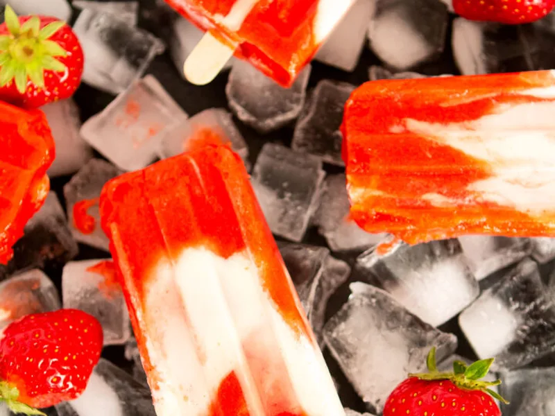 Homemade popsicles layered with fresh strawberry puree and whipped cream, swirled together for a marbled effect. Boil sugar syrup, blend strawberries with lemon juice, layer with sweetened cream in molds, and freeze overnight. Makes 10 fruity, creamy frozen treats perfect for warm weather.
