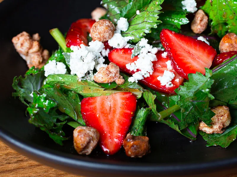 A vibrant salad combining peppery arugula and hearty Tuscan kale with sweet strawberries and tangy white balsamic vinaigrette. Candied hazelnuts dusted with cocoa add richness while fresh herbed feta provides creamy contrast. Perfect for spring entertaining or elegant lunches, this salad balances sweet, savory, and bitter flavors with varying textures from crisp greens to crunchy nuts.