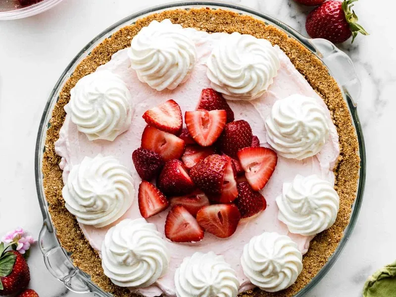 Creamy no-bake strawberry cheesecake with a salty-sweet pretzel graham cracker crust. Homemade strawberry puree folded into whipped cream cheese creates a light, fluffy filling. Chilled overnight for optimal texture, topped with fresh strawberries and whipped cream just before serving.