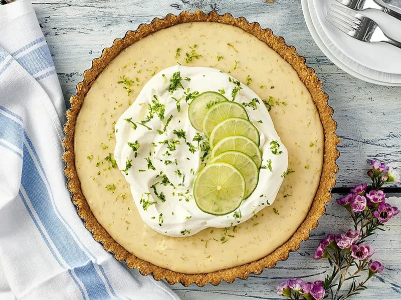 A tangy-sweet key lime pie adapted for Swedish kitchens, built on a buttery digestive biscuit base that provides satisfying crunch against the creamy, custard-like filling. The magic lies in the combination of sweetened condensed milk, fresh lime zest, and bright lime juice that creates a perfectly balanced tartness without requiring actual key limes. This no-bake-style pie (the filling sets in the oven but requires no whipping) is ideal for anyone intimidated by traditional meringue-topped versions. Serve it chilled after several hours in the refrigerator, dusted with powdered sugar and topped with whipped cream. What sets this version apart is its reliance on digestive biscuits instead of graham crackers and the emphasis on fresh lime zest alongside juice, which deepens the citrus flavor. Perfect for summer gatherings, dinner parties, or whenever you need an impressive dessert that comes together without fuss.