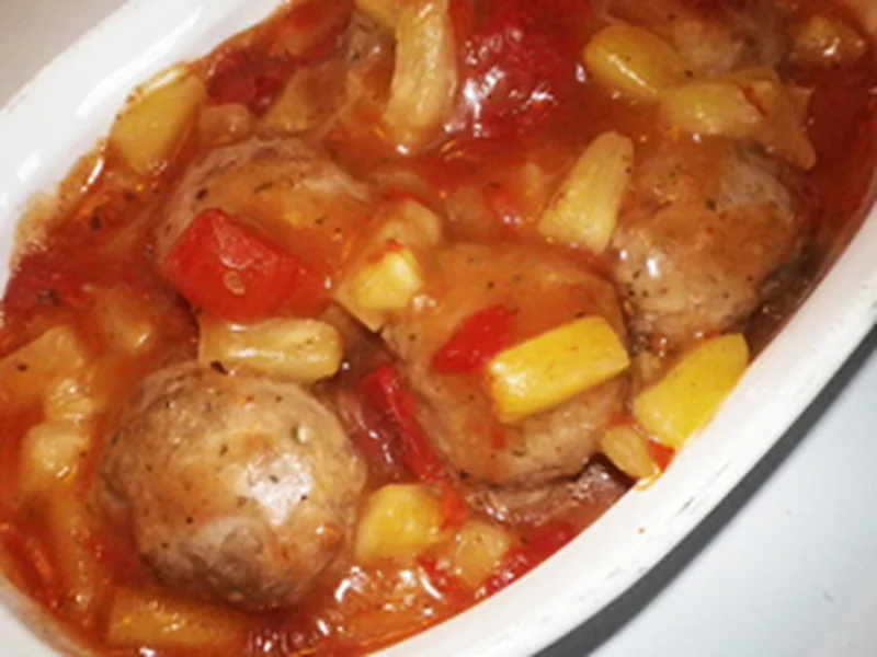 A tangy-sweet sauce with pineapple chunks and fresh peppers coating homemade meatballs, finished in the oven for a glossy, cohesive dish. Balanced vinegar and Splenda create the signature sweet-sour profile, while Worcestershire and hot sauce add depth. Perfect for weeknight dinners or casual entertaining, served over rice or noodles. This version uses fresh bell pepper added mid-bake to retain texture and color against softer canned tomatoes.